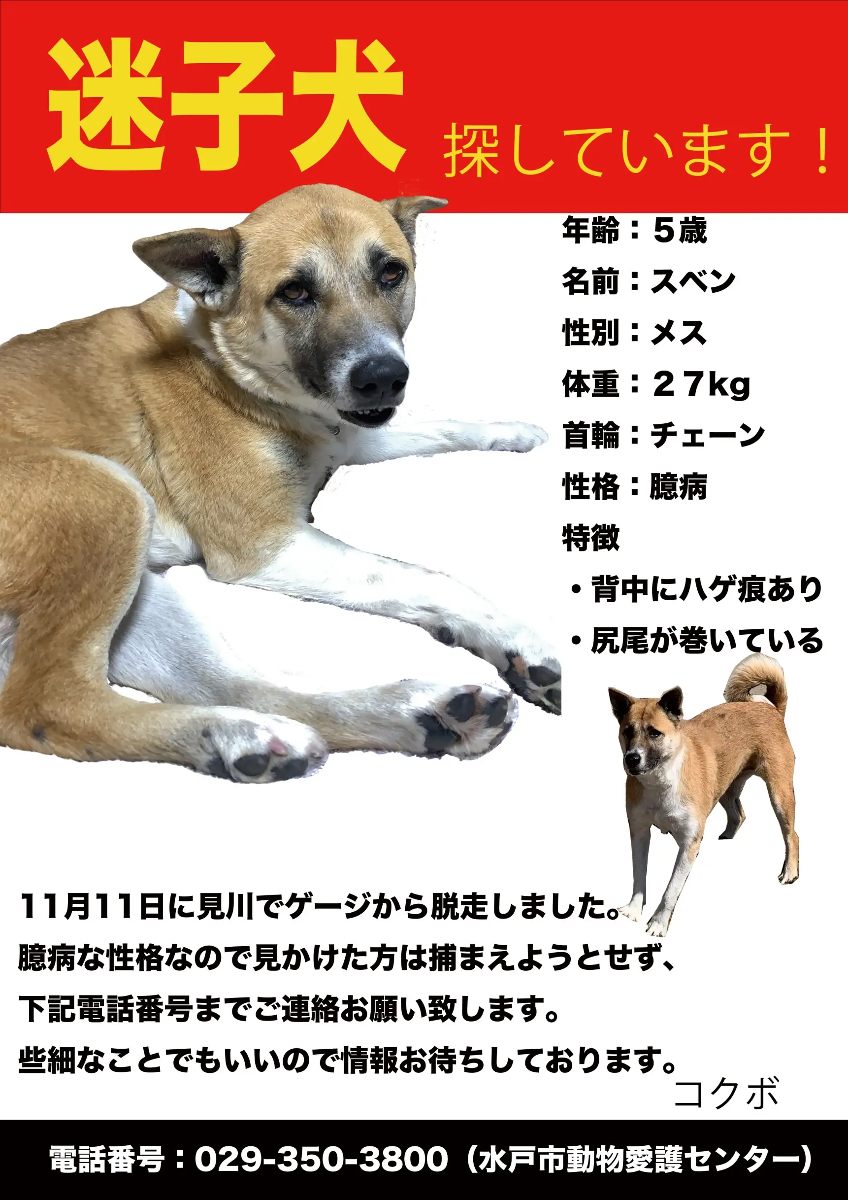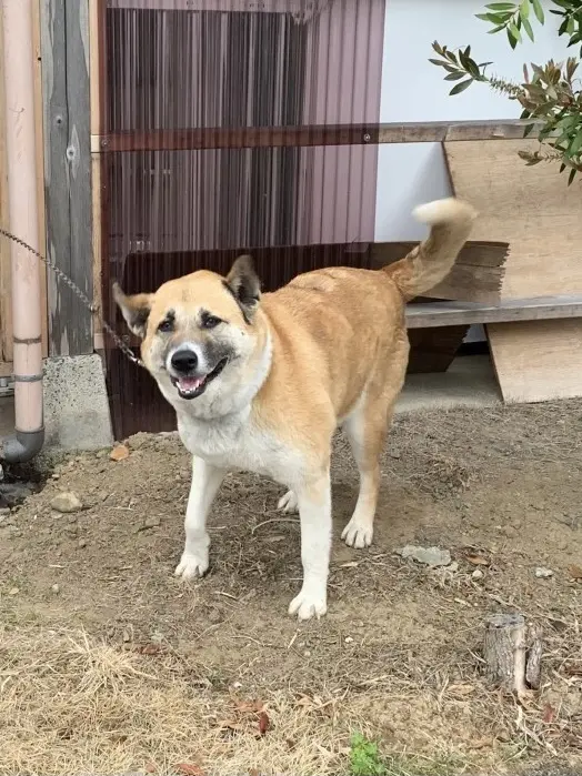 チェーンの首輪 尻尾が巻いている 立ち耳 茶色と白で顔は黒が入っている