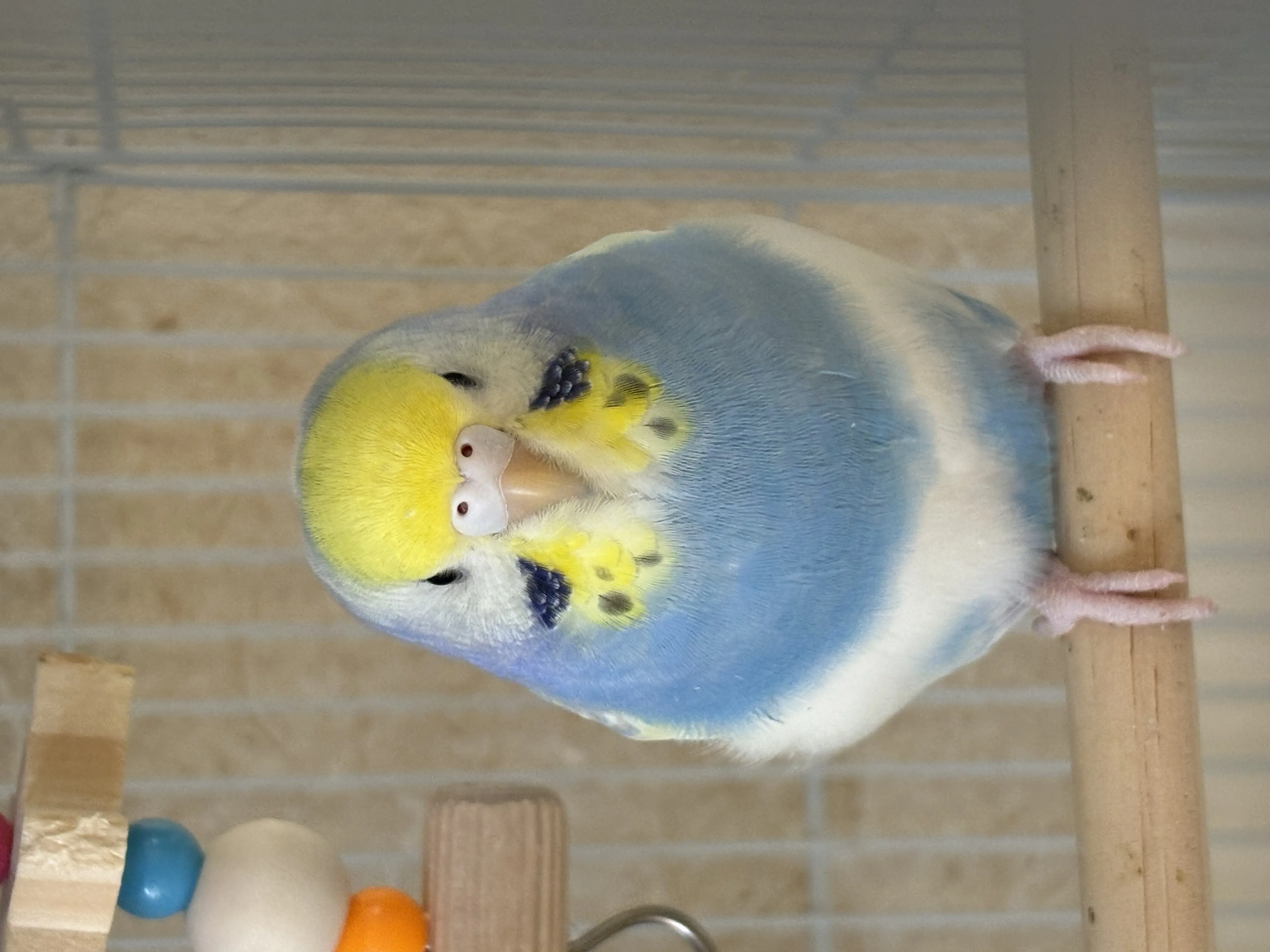 頭が黄色で、体は水色と白と黄色のセキセイインコです。ビビりな性格です 鼻はピンクです