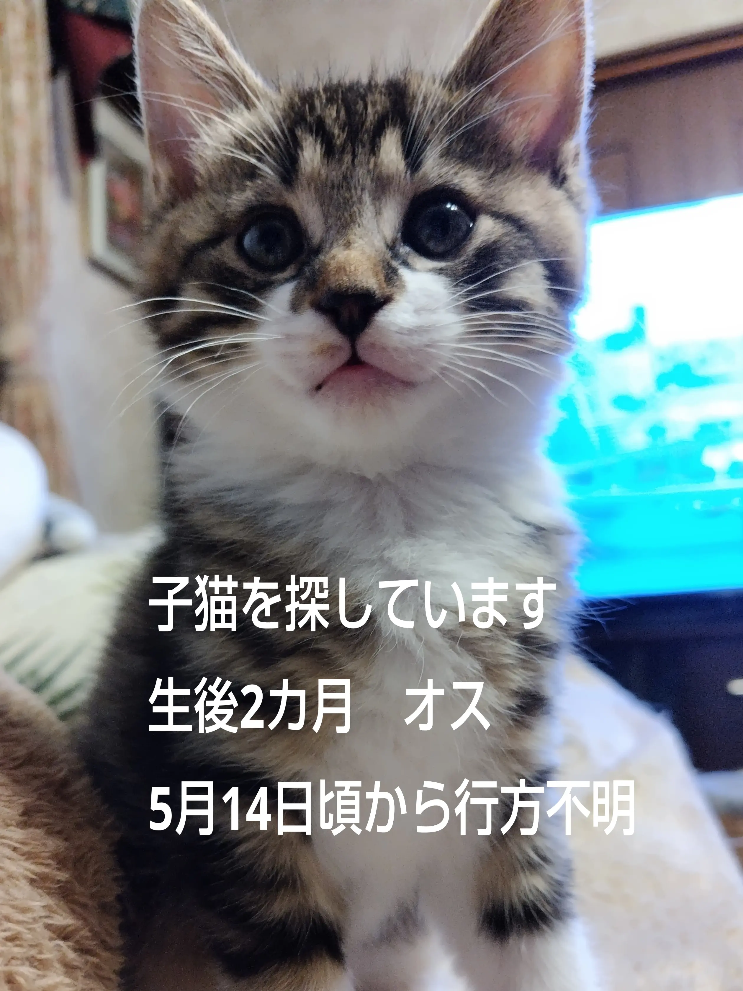 キジトラの丸顔の男の子です。2025年5月時点で生後2カ月。しっぽは真っすぐで長くしましま模様があります。いちくんと呼ぶと返事をし、人に慣れていますが、お外だとかなり怖がっていると思い ます。譲渡先から2日で行方不明になりとても心配です。お見かけした方はどうかご連絡下さい。些細な情報でも構いません。