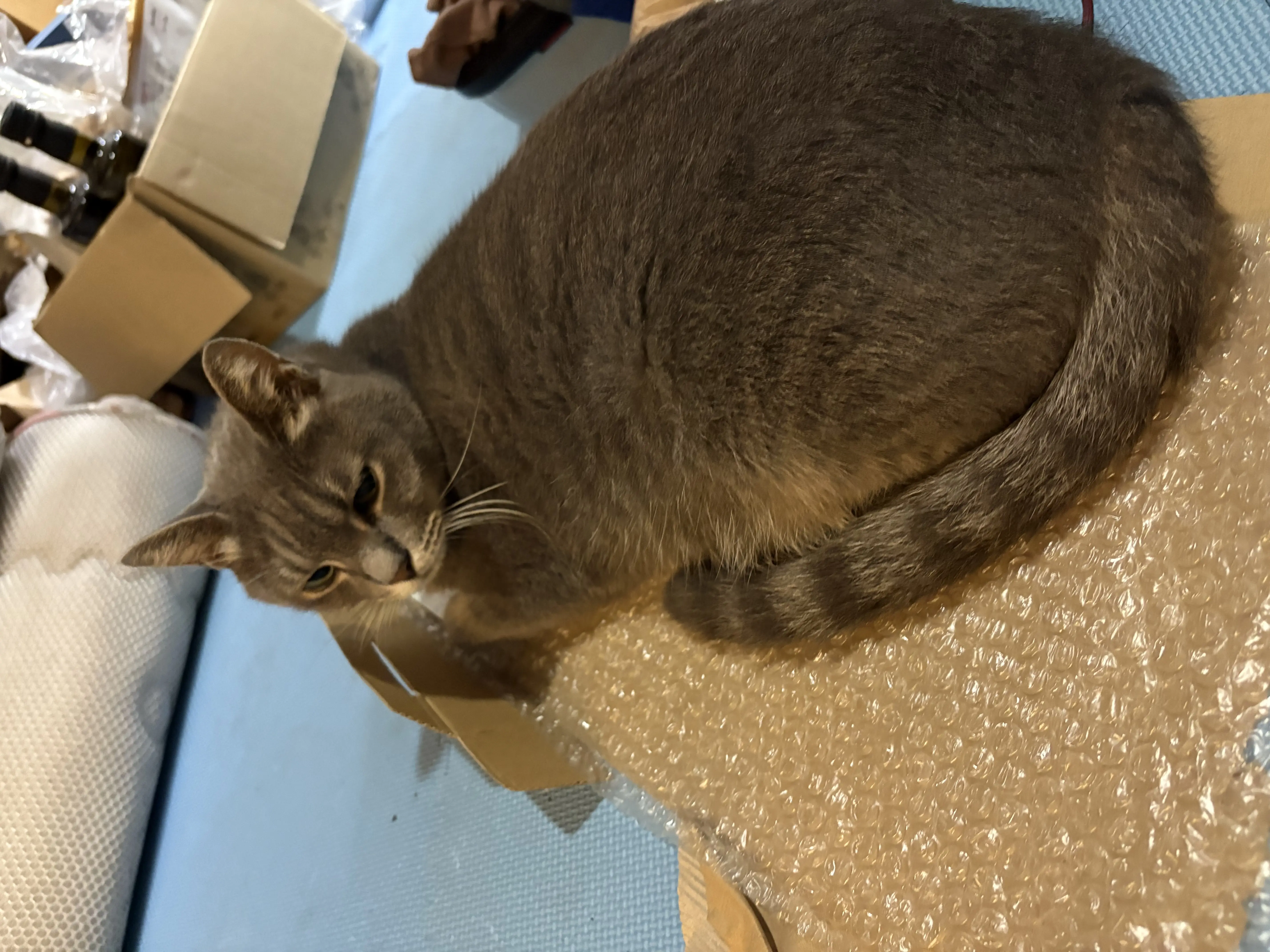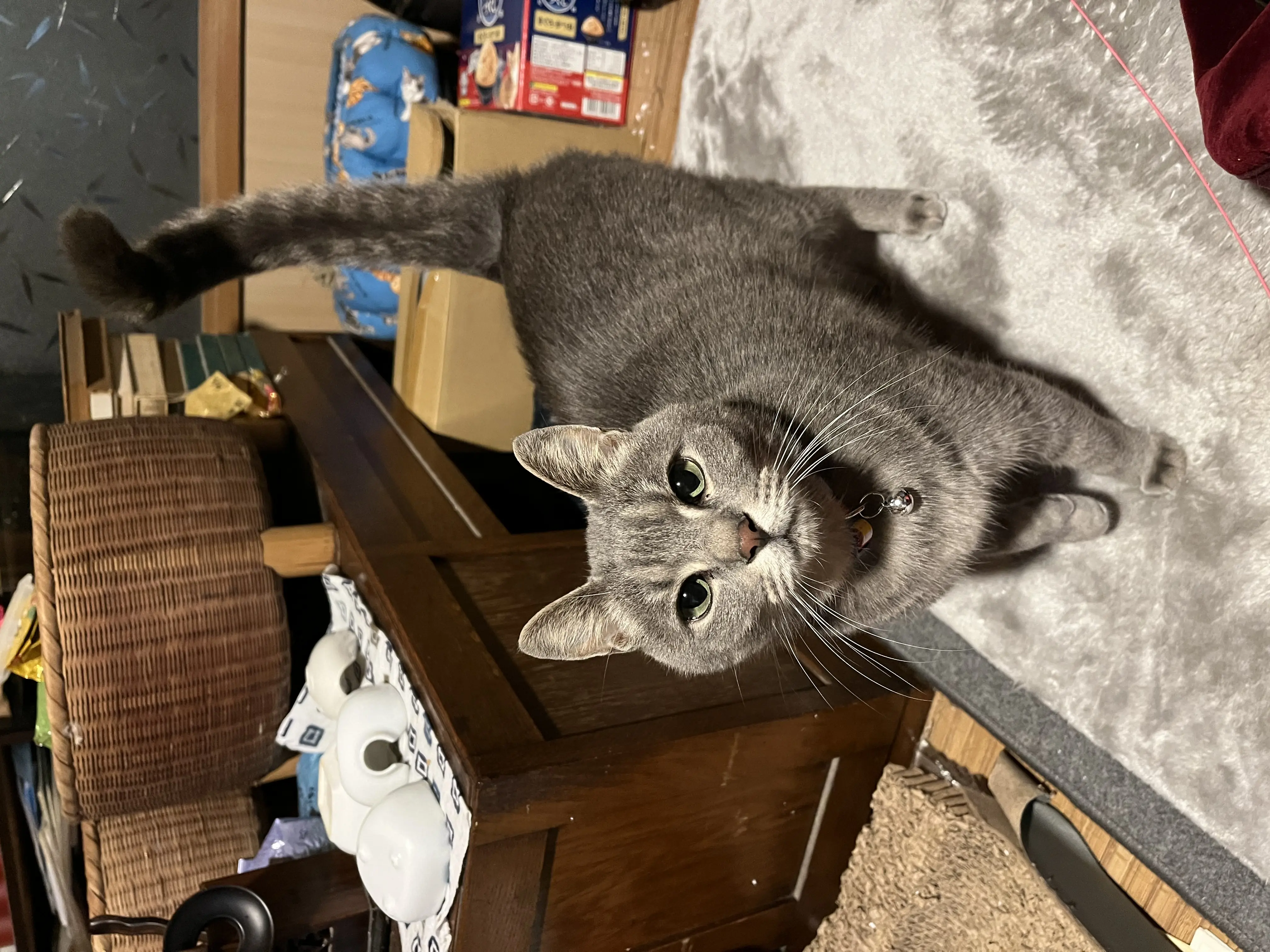 首輪は白地に緑、青っぽい幾何学模様。 グレー地に縞あり。 尻尾は長く、目はグリーン。 体重4キロ強.少しポッテリした印象あり。