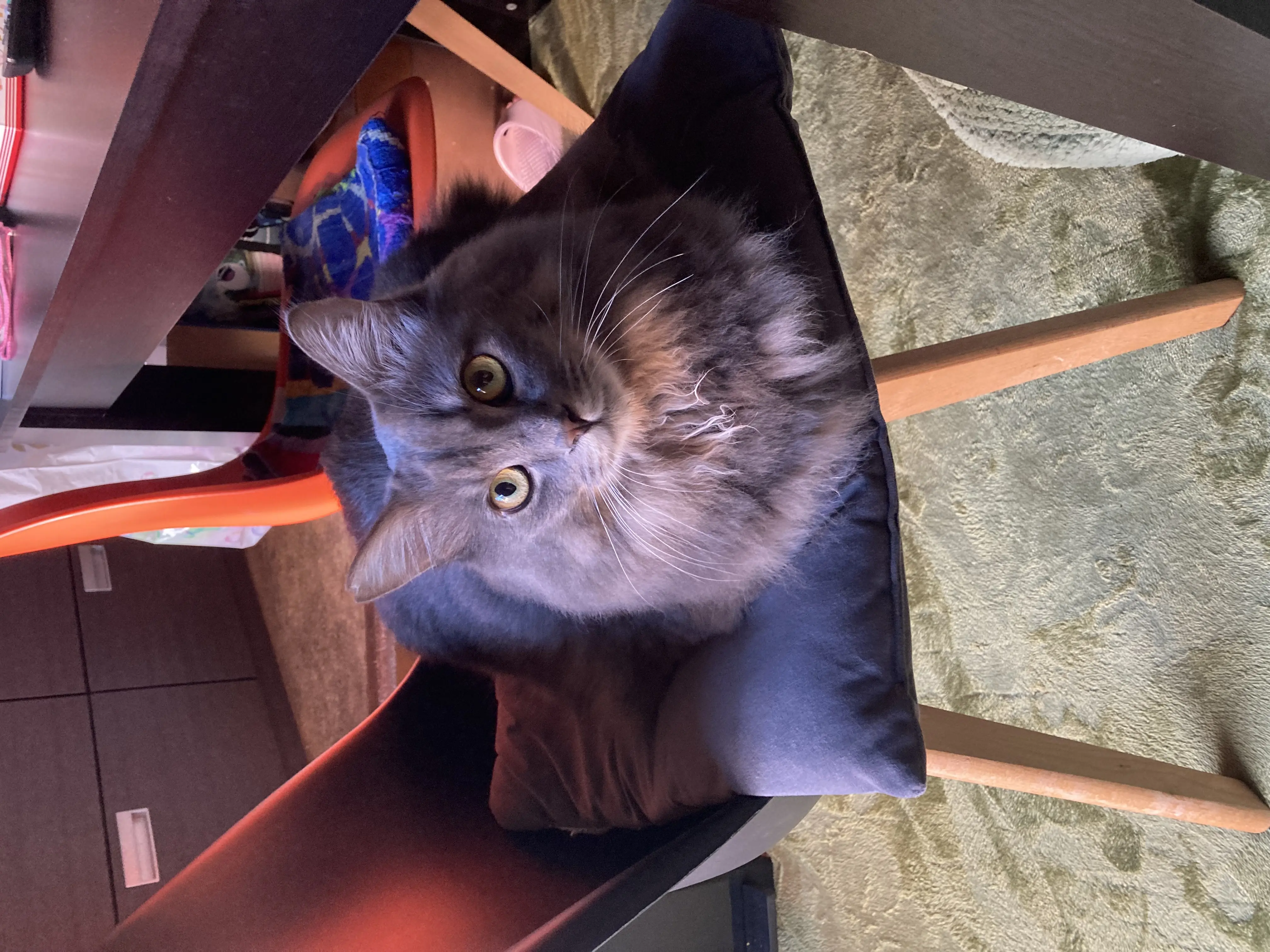 グレーの長毛猫 アゴの所と首の所だけ少しだけ白いです。 首輪なし。右耳に去勢済みのカットあり(小さくさくら耳)