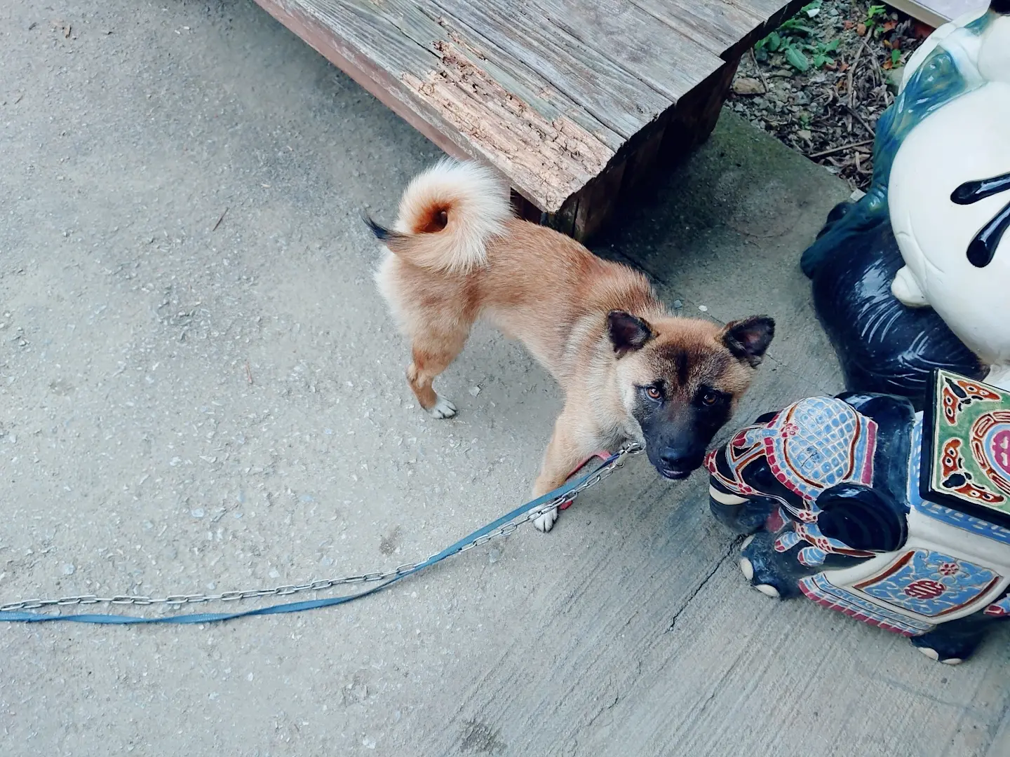 小柄 顔が黒い 足が靴下を履いているみたいに白い 赤い首輪をつけている 尻尾がくるんと丸まっている