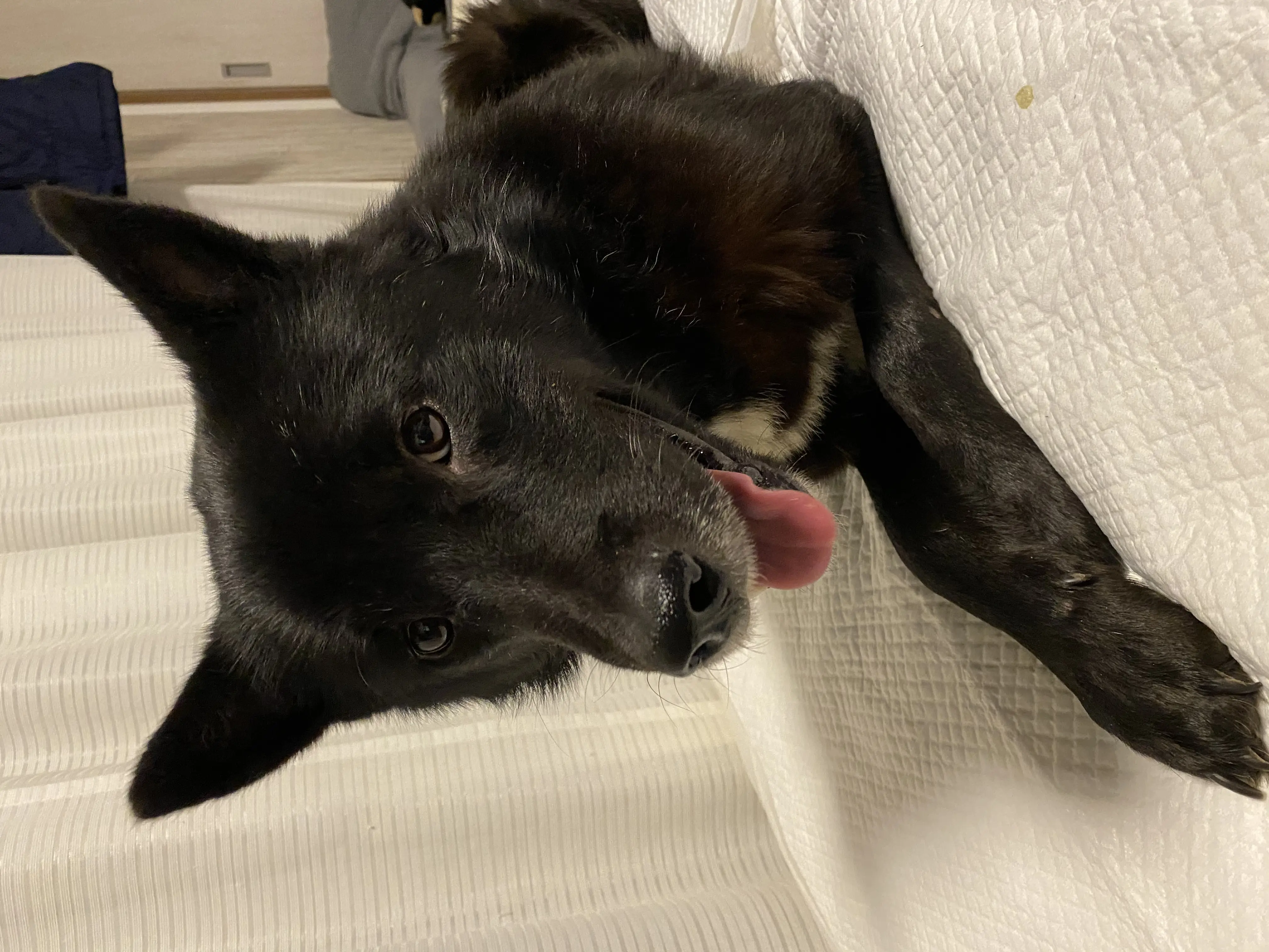 黒で口元が白、首から胸にかけて白の一本線、大柄の細身、大きな立ち耳、首輪はしていません。お山生まれのお山育ちの元野犬、とても臆病で人慣れしておらず小さな音にも驚いてしまいます。吠えたり噛んだりせず、とても優しい性格です。