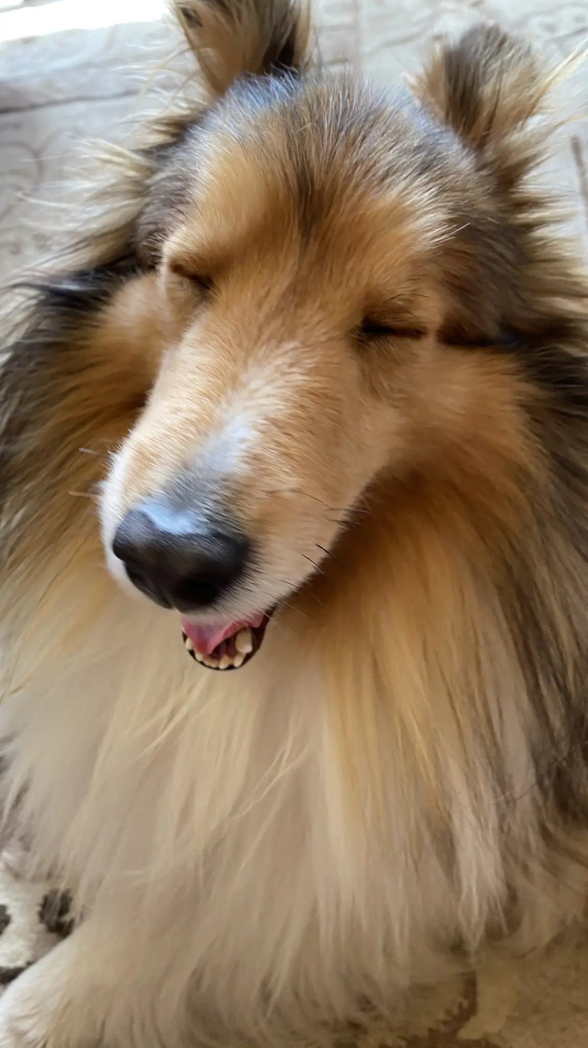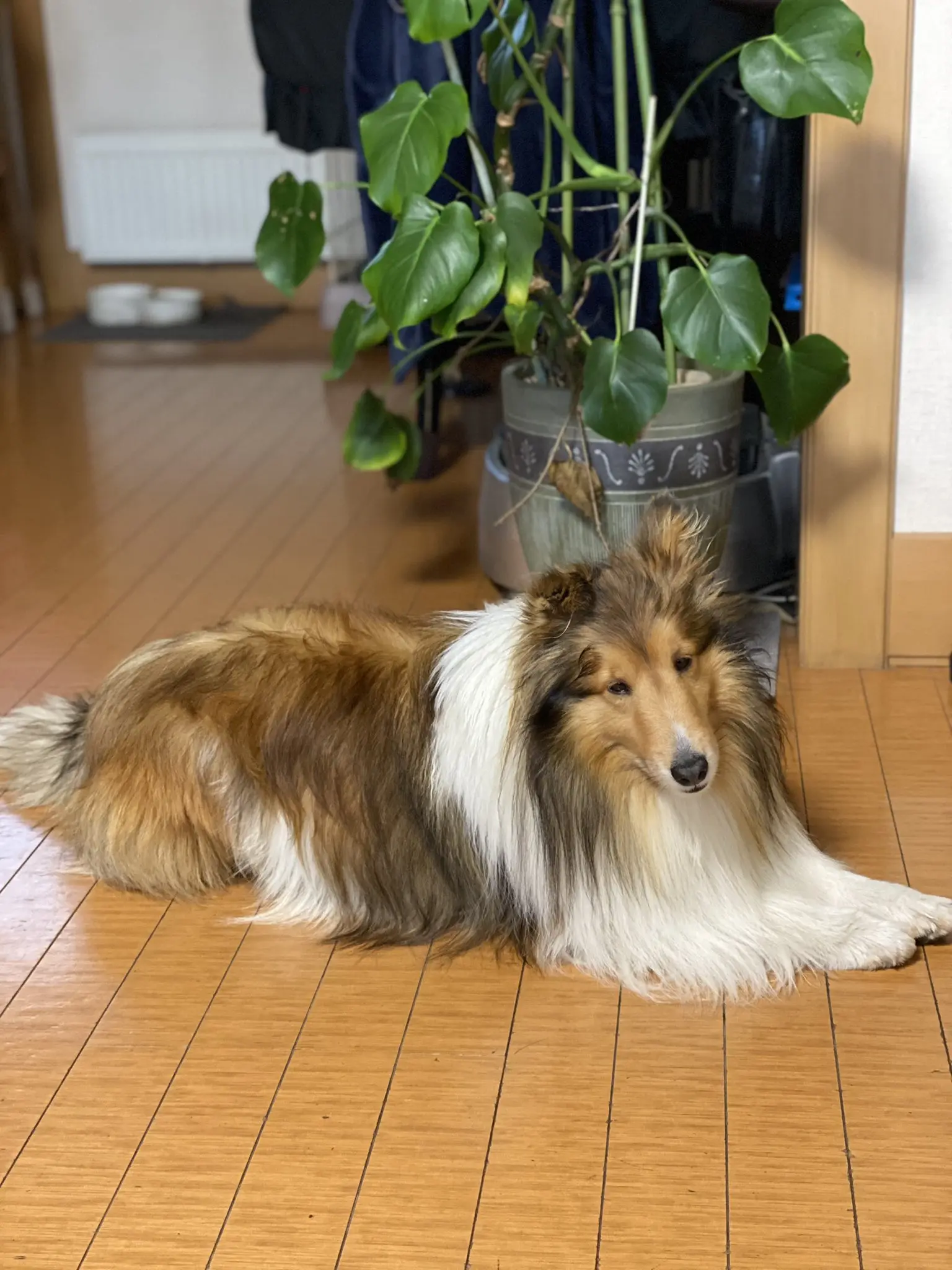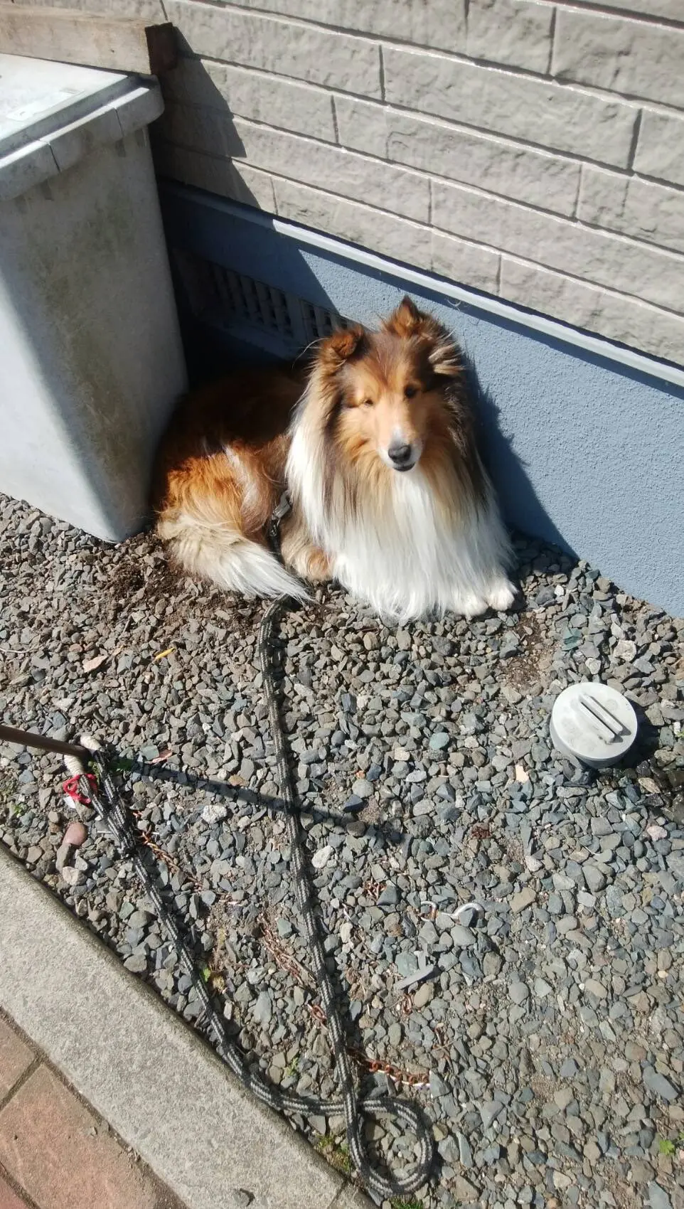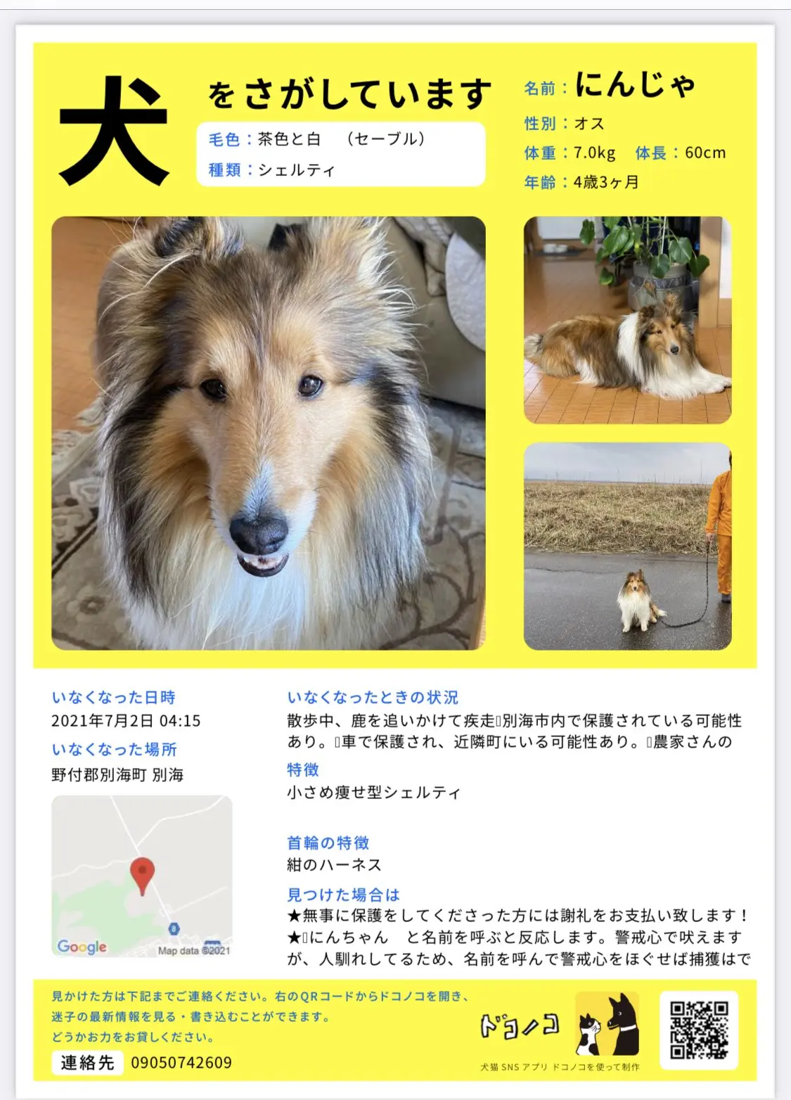 名前は「にんじゃ」 体重7.0kg、体長60cm、小さめ痩せ型シェルティ、首輪は紺のハーネス。