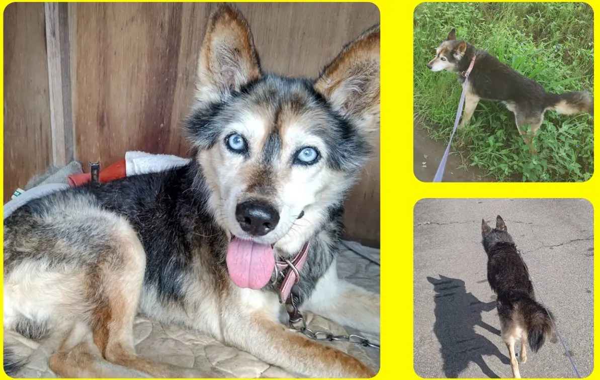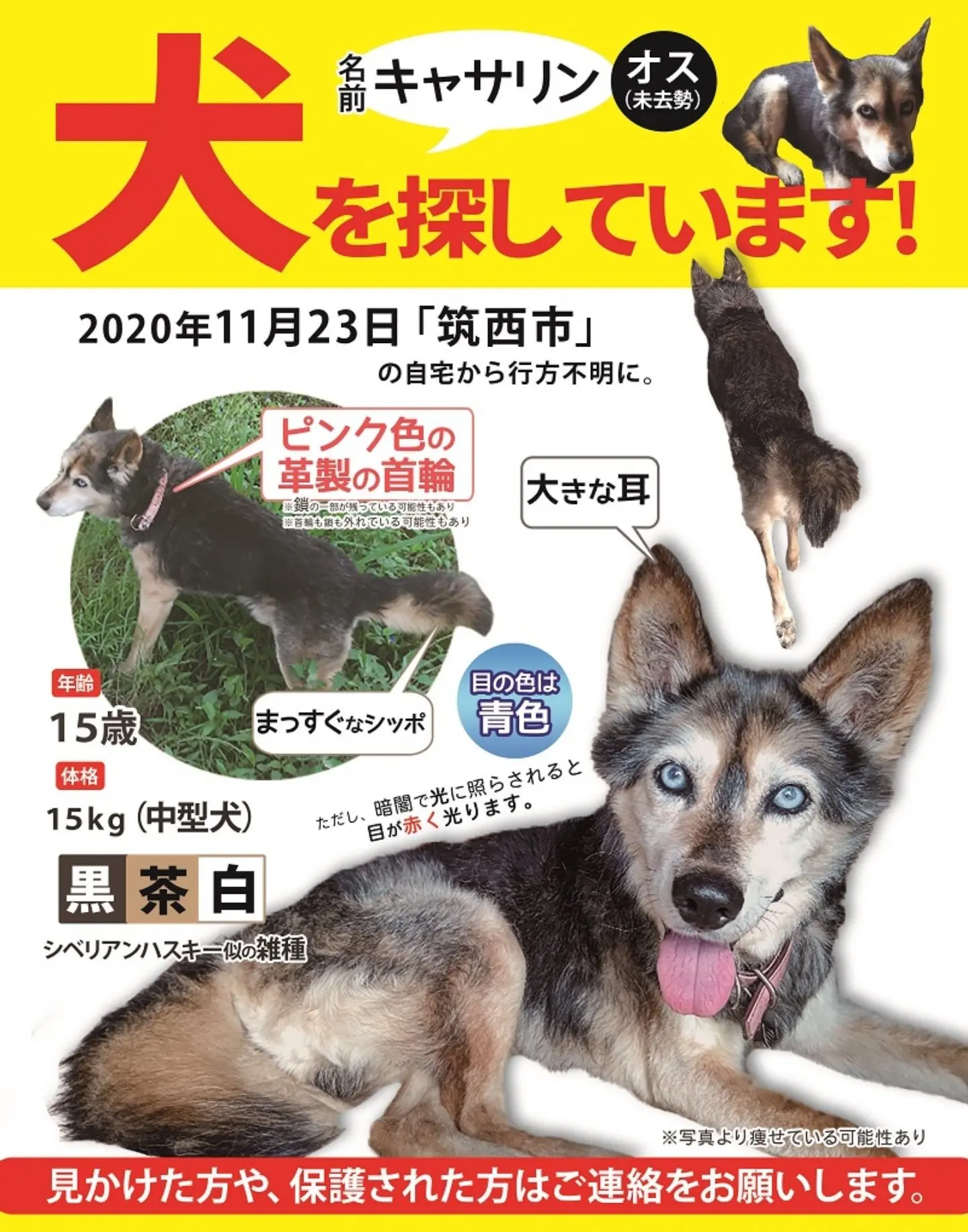中型犬(15キロ前後)、 毛色は黒茶クリーム色、 立ち耳、まっすぐな尻尾、 シベリアンハスキーに似ている、 目が青い、 目の回りがアイラインみたいに黒い、 耳が大きい、