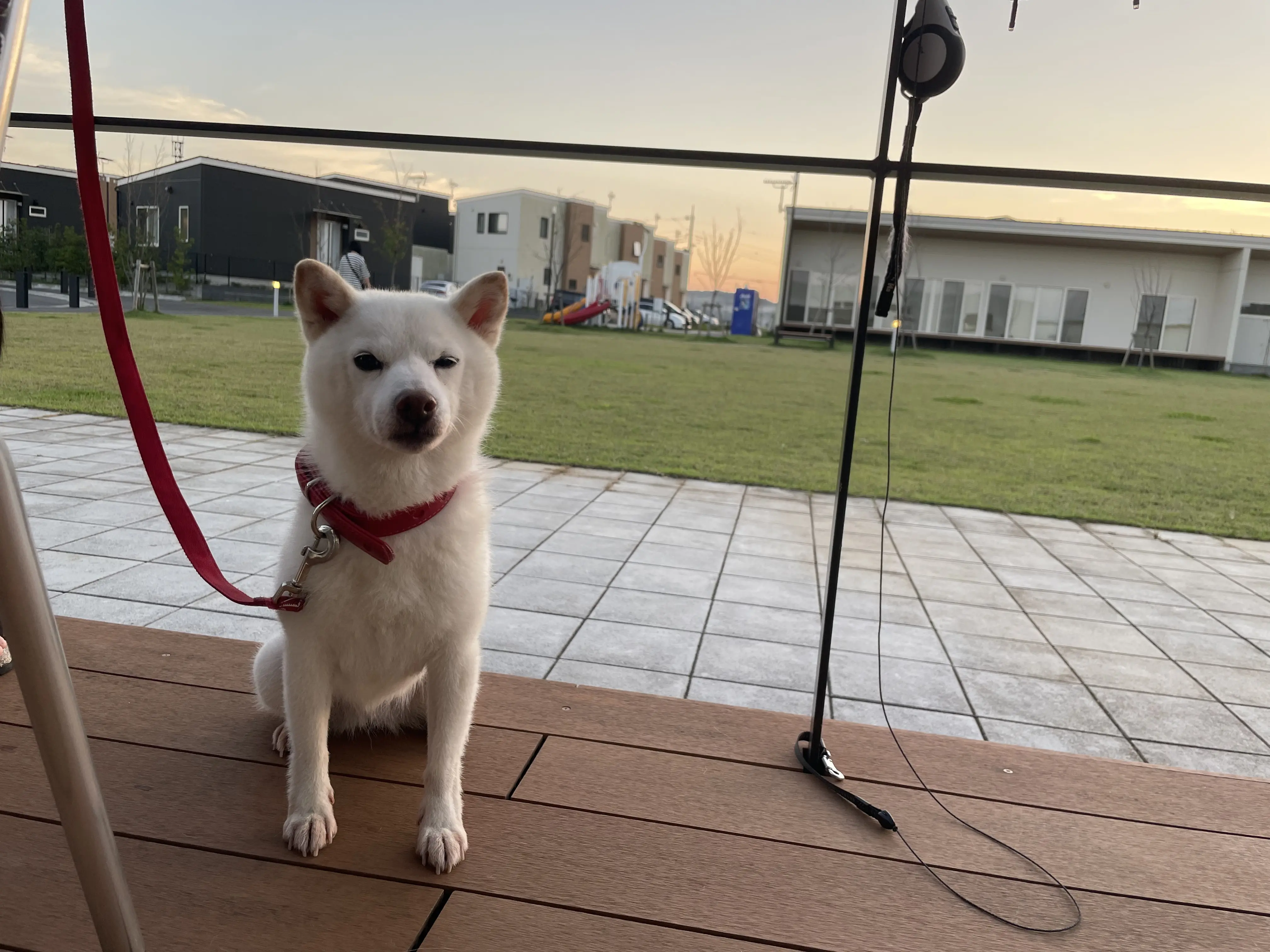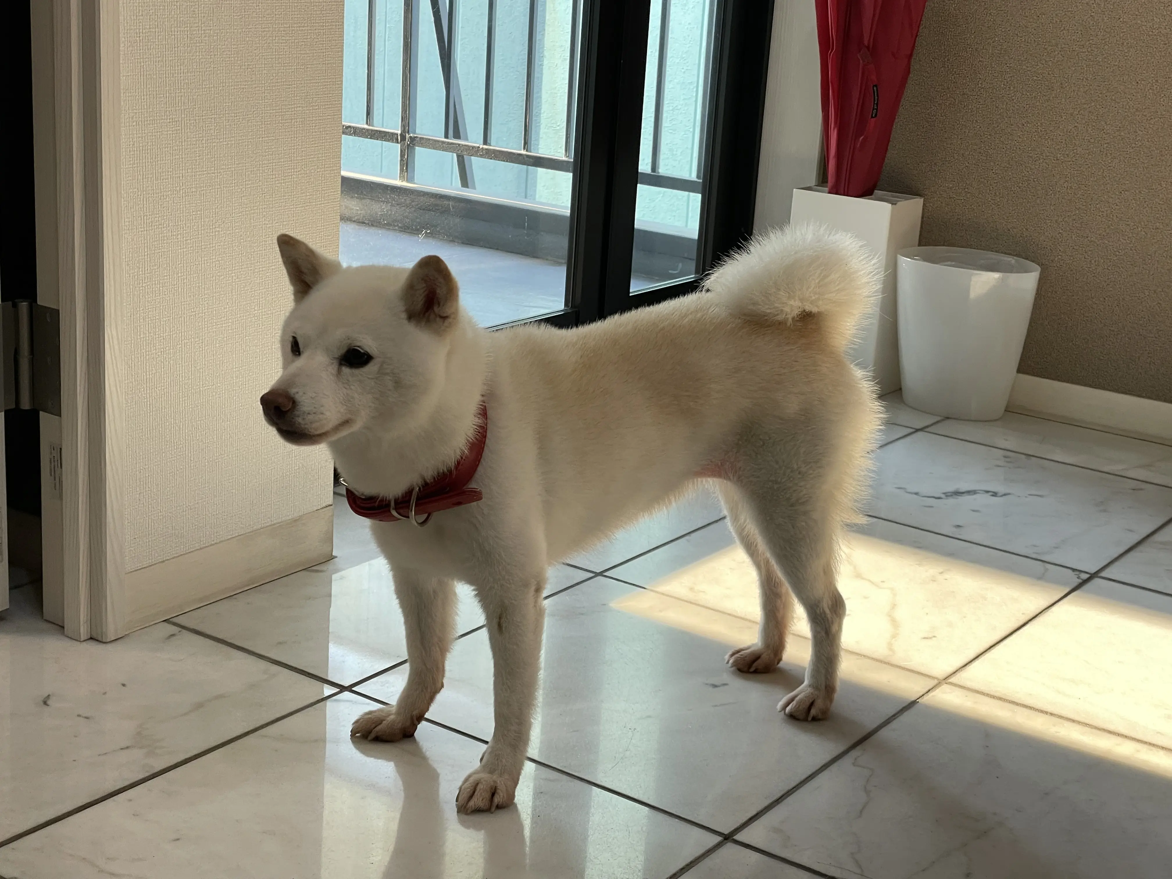 白い小さめの柴犬です。 耳崎が茶色く 赤いハートの首輪をしています。