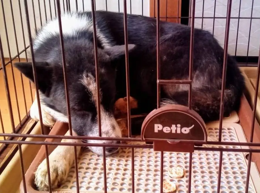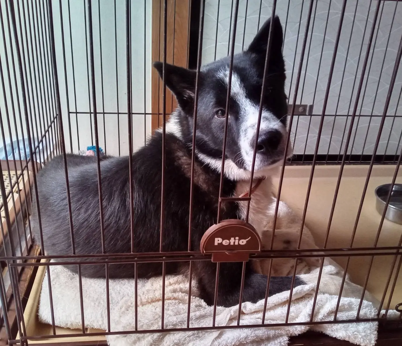 黒白(鼻すじからあご、首まわり、胸、足としっぽの先が白い)/大きめの中型犬20kg/赤い革の首輪(外れていなければ)