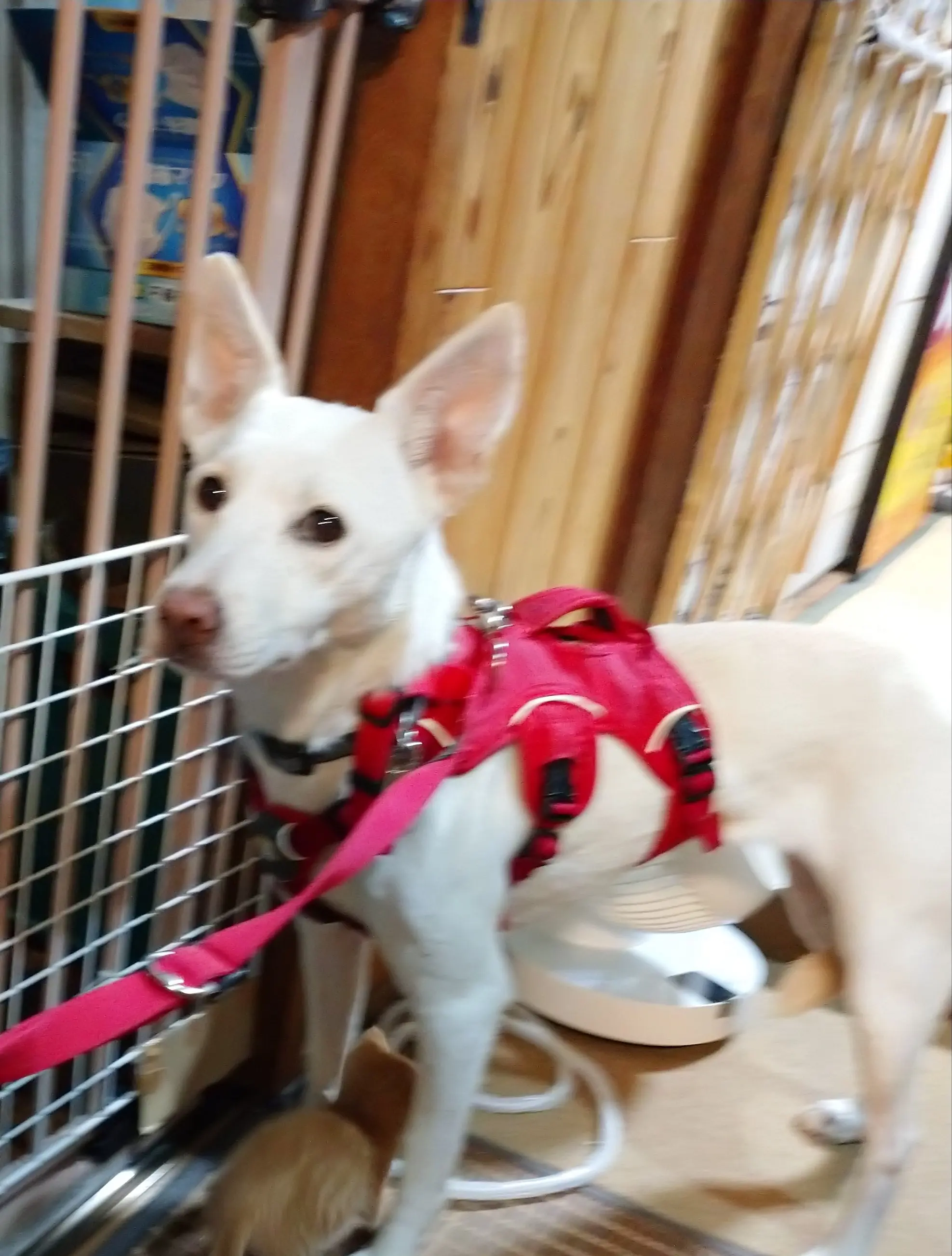 白の毛に真っ赤なハーネス装着 12kの中型犬で耳はピンと立っていて大きいです。 首輪は付いていません
