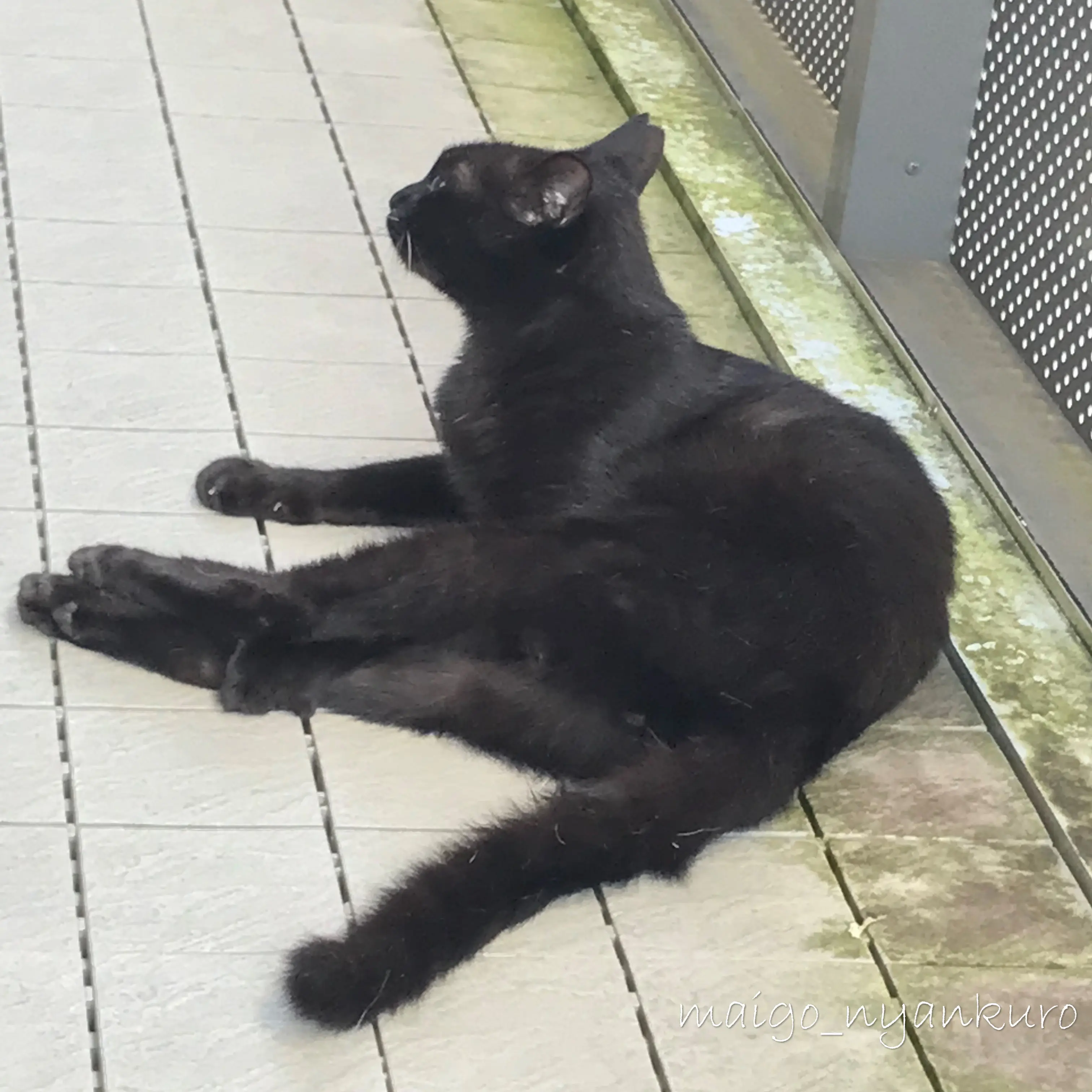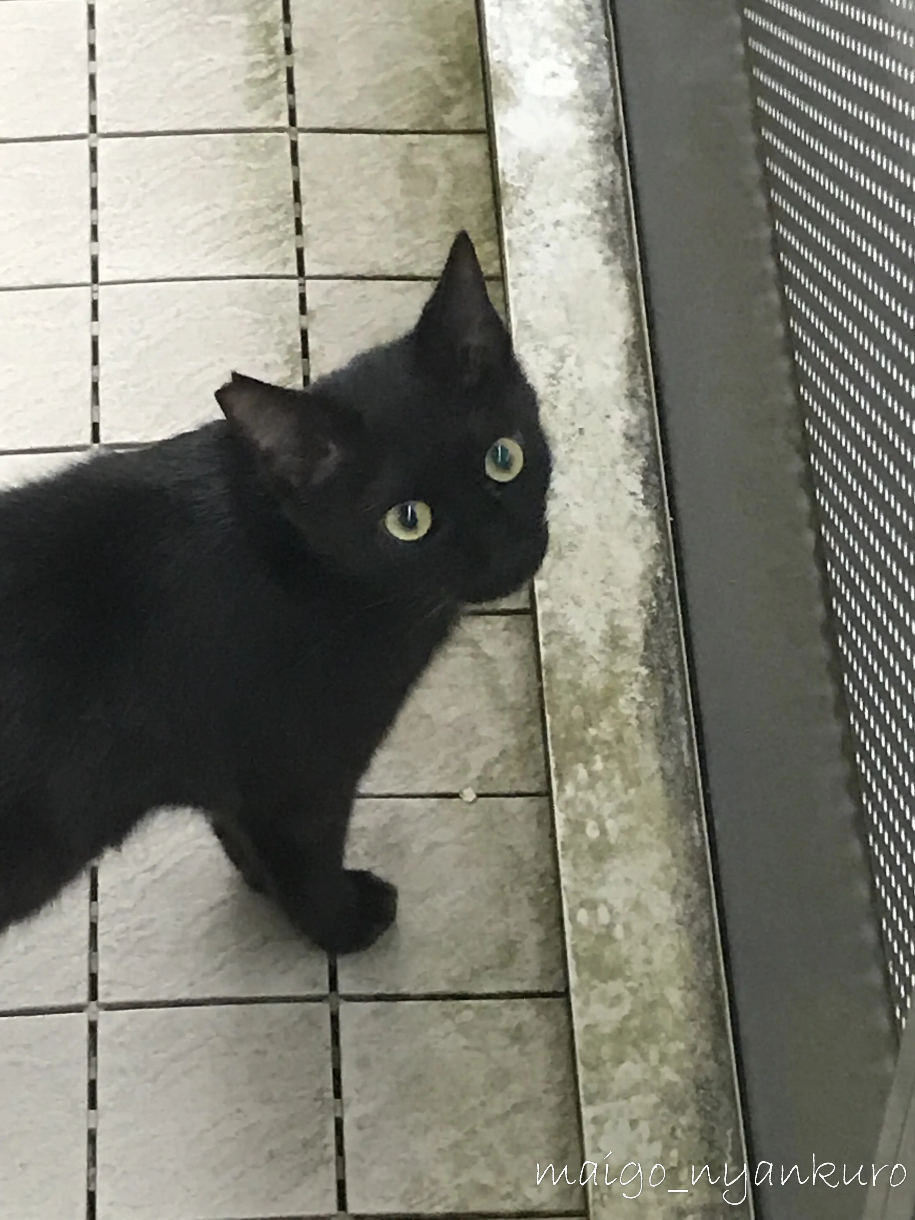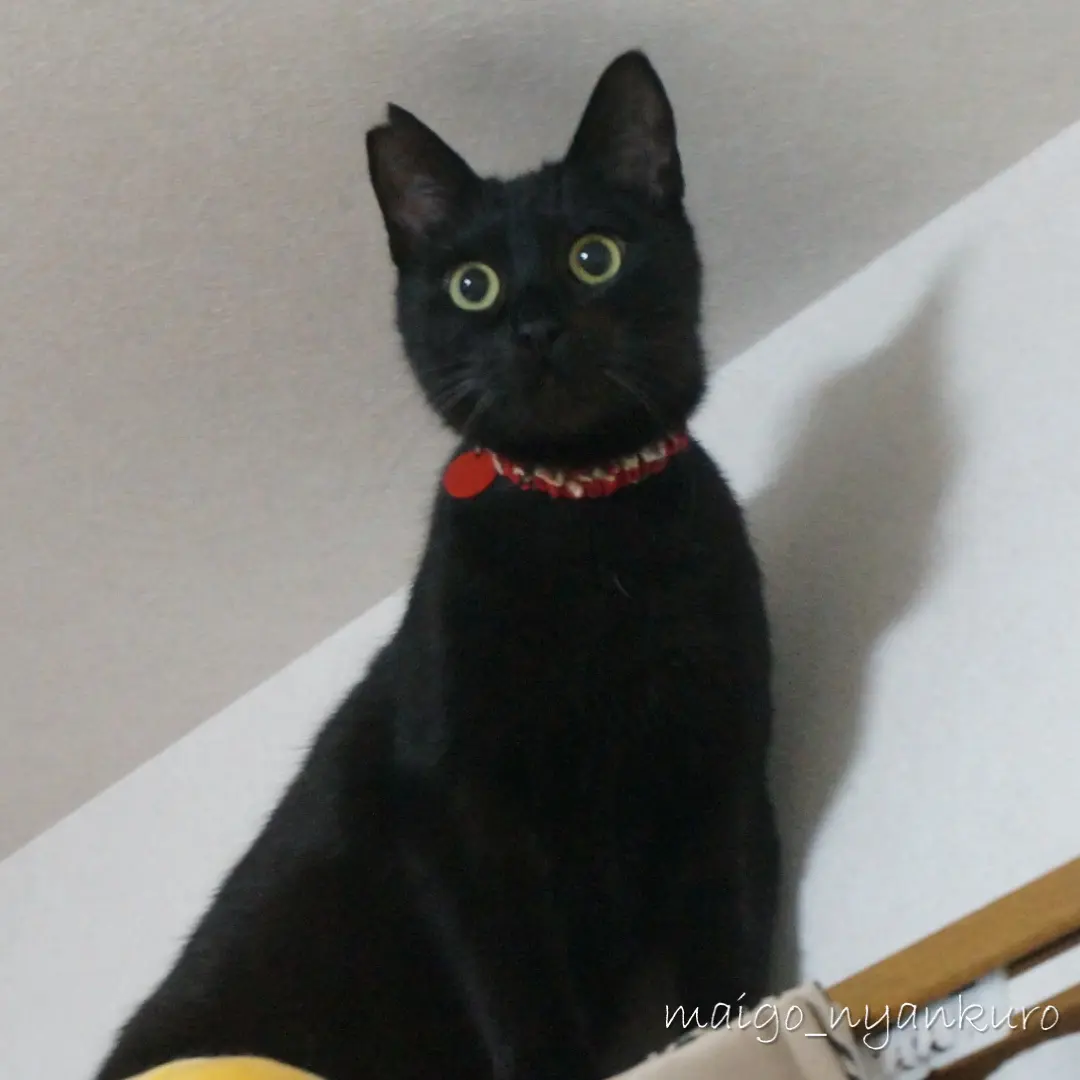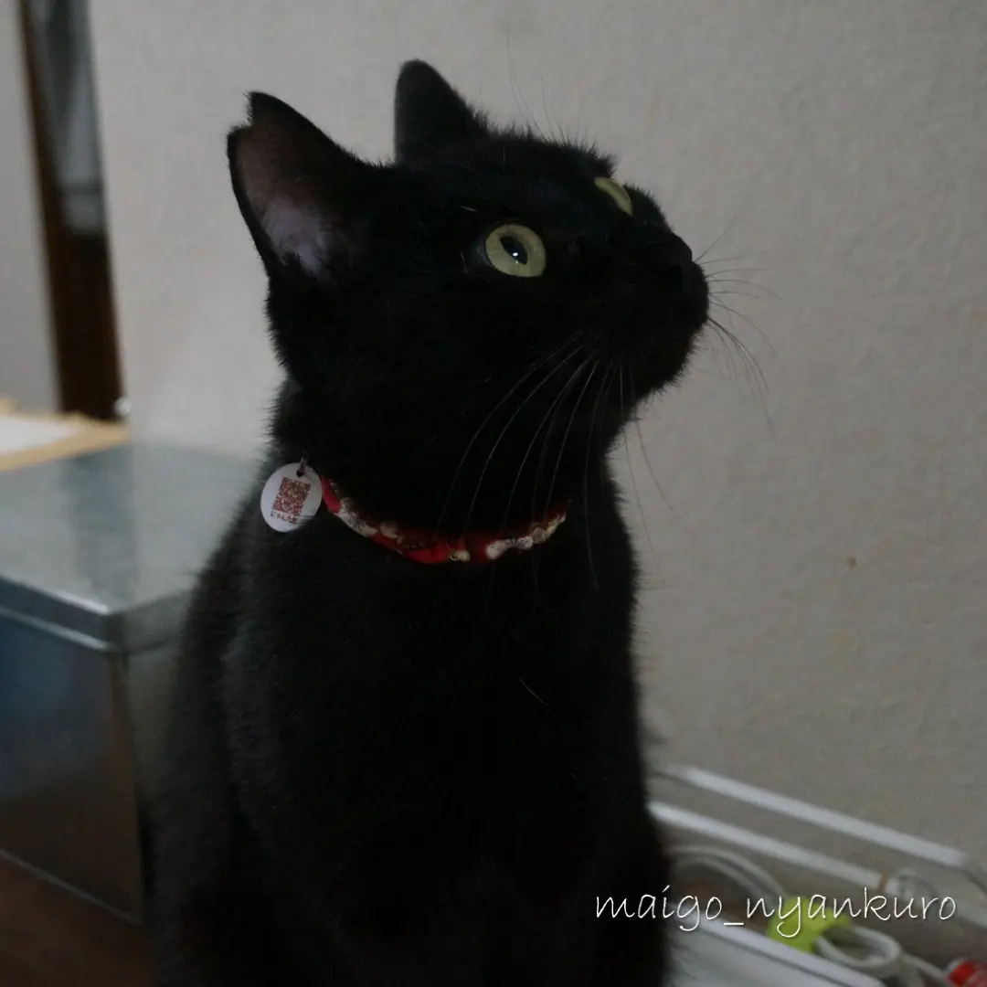 全身真っ黒で、白い部分はありません。右耳に去勢済みの印の小さなV字のカットがあります。しっぽは細く、体長に対してやや長めです。目は黄色です。行方不明当時は、赤いシュシュ首輪に丸い迷子札(名前とQRコードの刻印)をつけていましたが、時間も経ち外れている可能性が高いです。