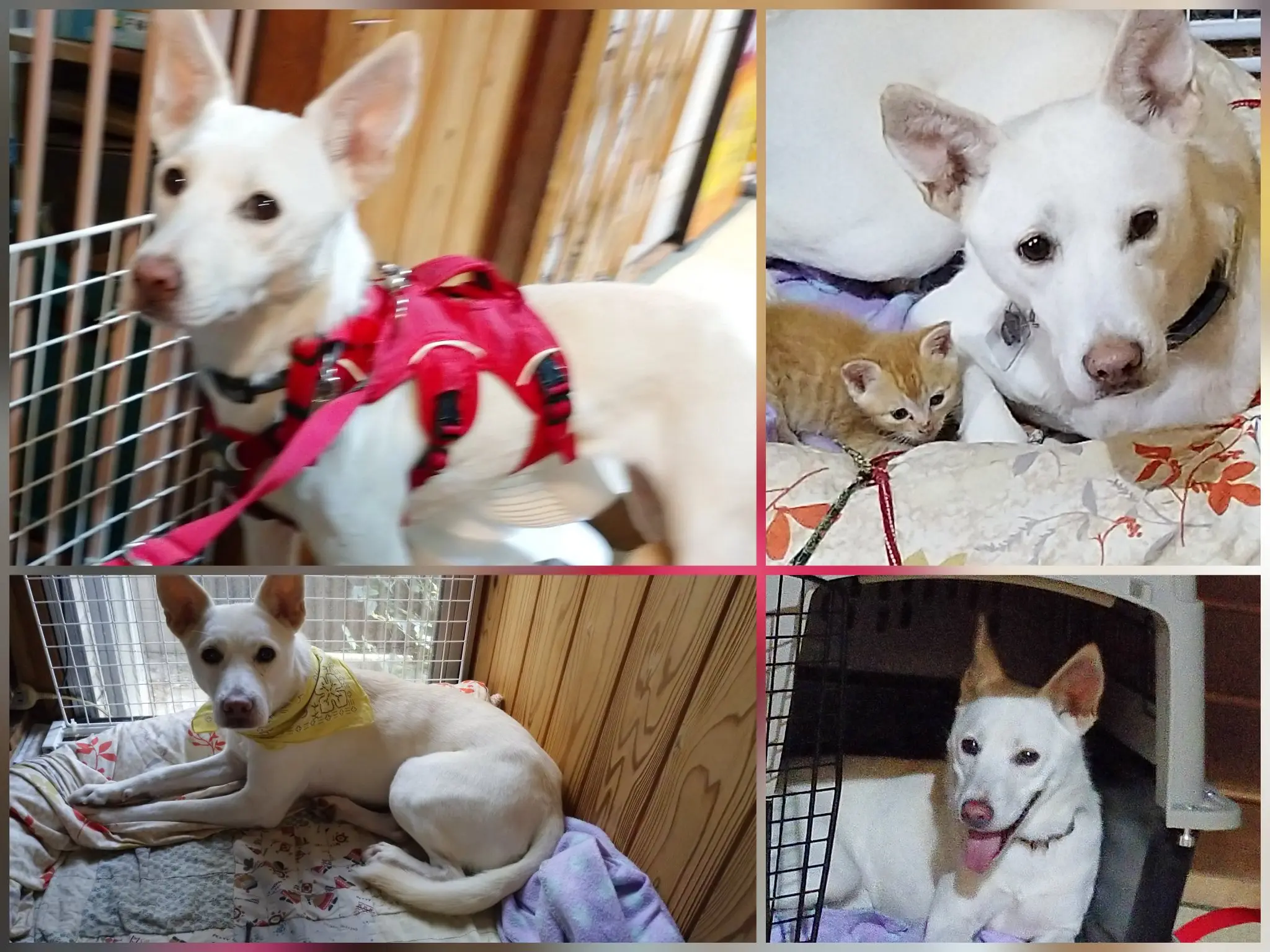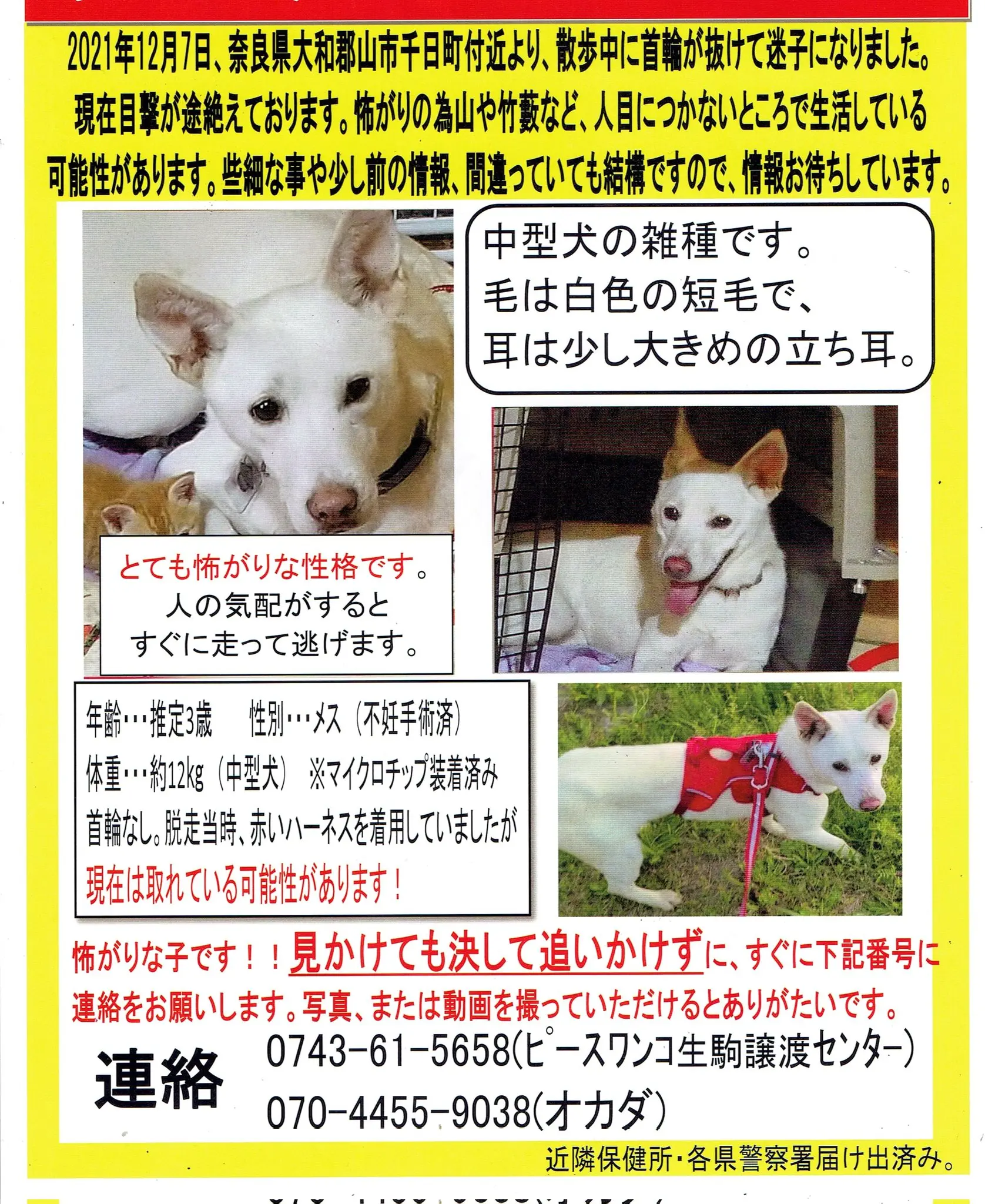 中型犬の雑種です。 毛は白色の短毛で、耳は少し大きめの立ち耳。 首輪はなし。 脱走時、赤いハーネスを着用していましたが現在は外れている可能差もあります。 マイクロチップ装着済み。