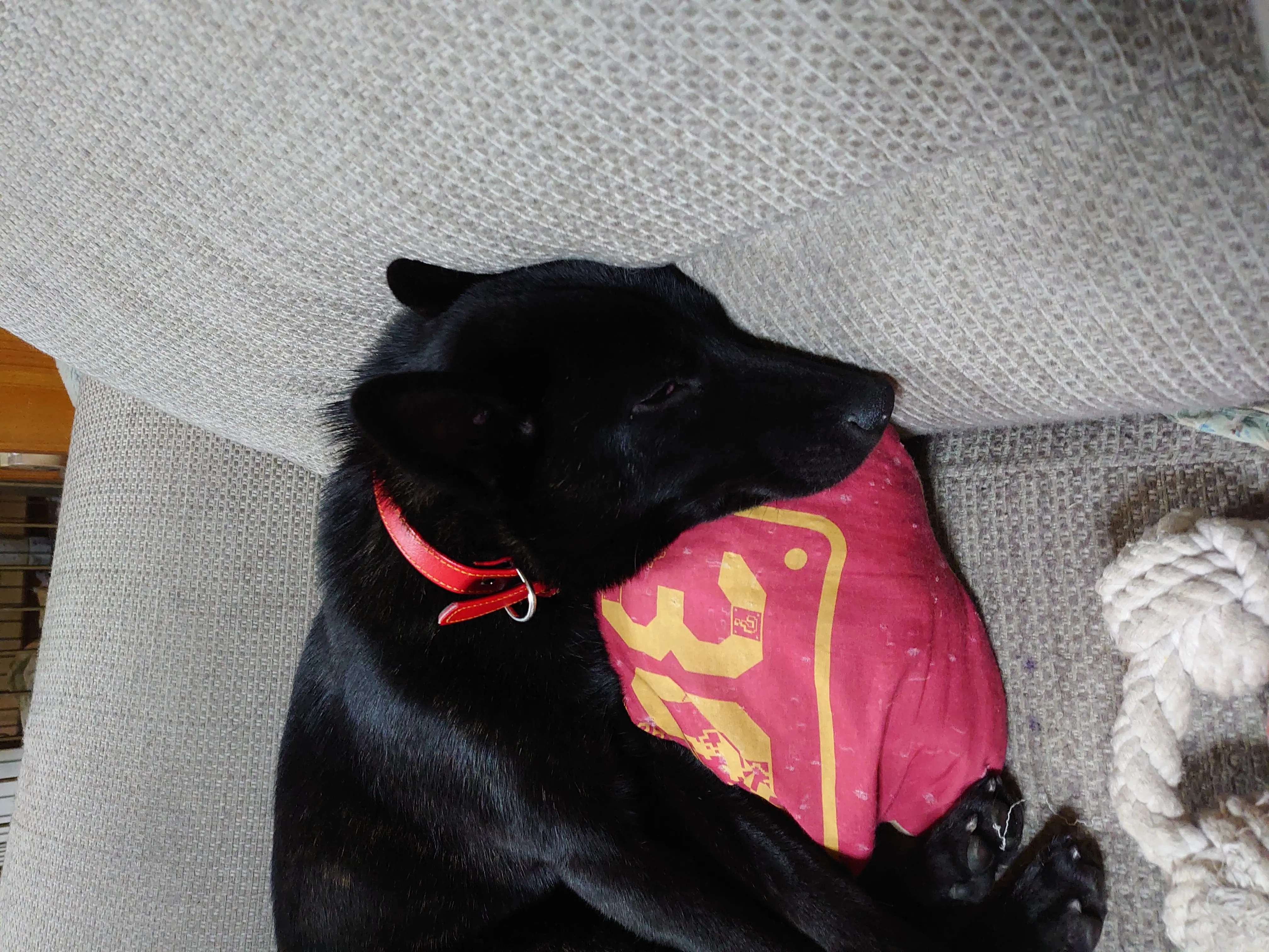 8ヶ月の子犬 赤い首輪 黒虎 避妊済み(手術痕があります)
