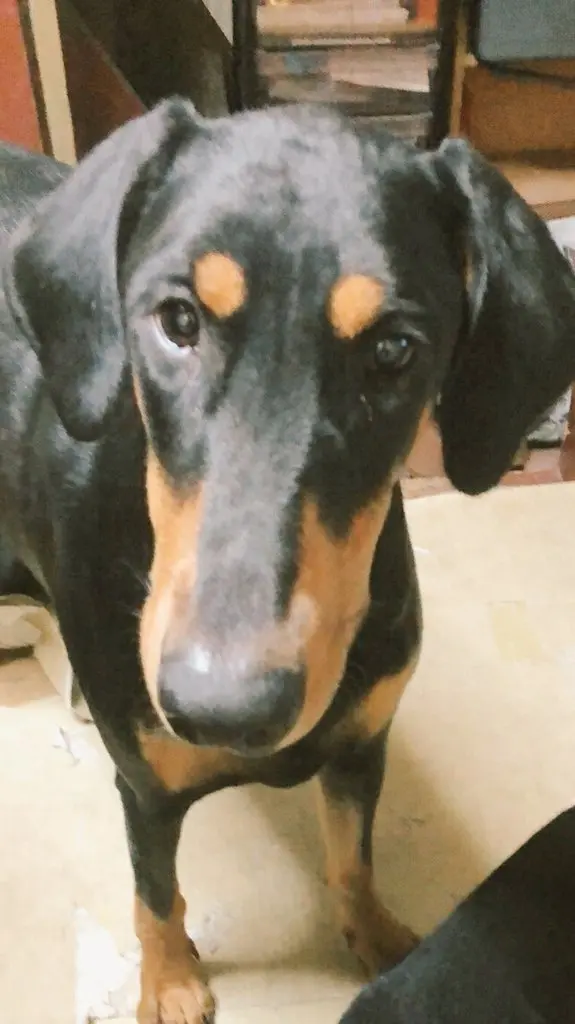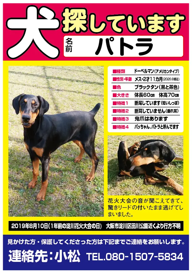 ブラックタン 垂れ耳 断尾 しっぽ先の毛は生えて無い 前足の鬼爪有り チェーンタイプの首輪は外れている可能性大 マイクロチップ無し