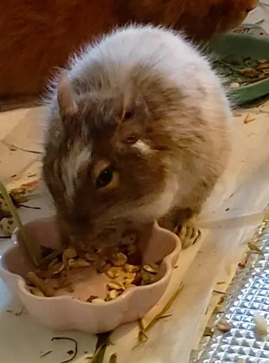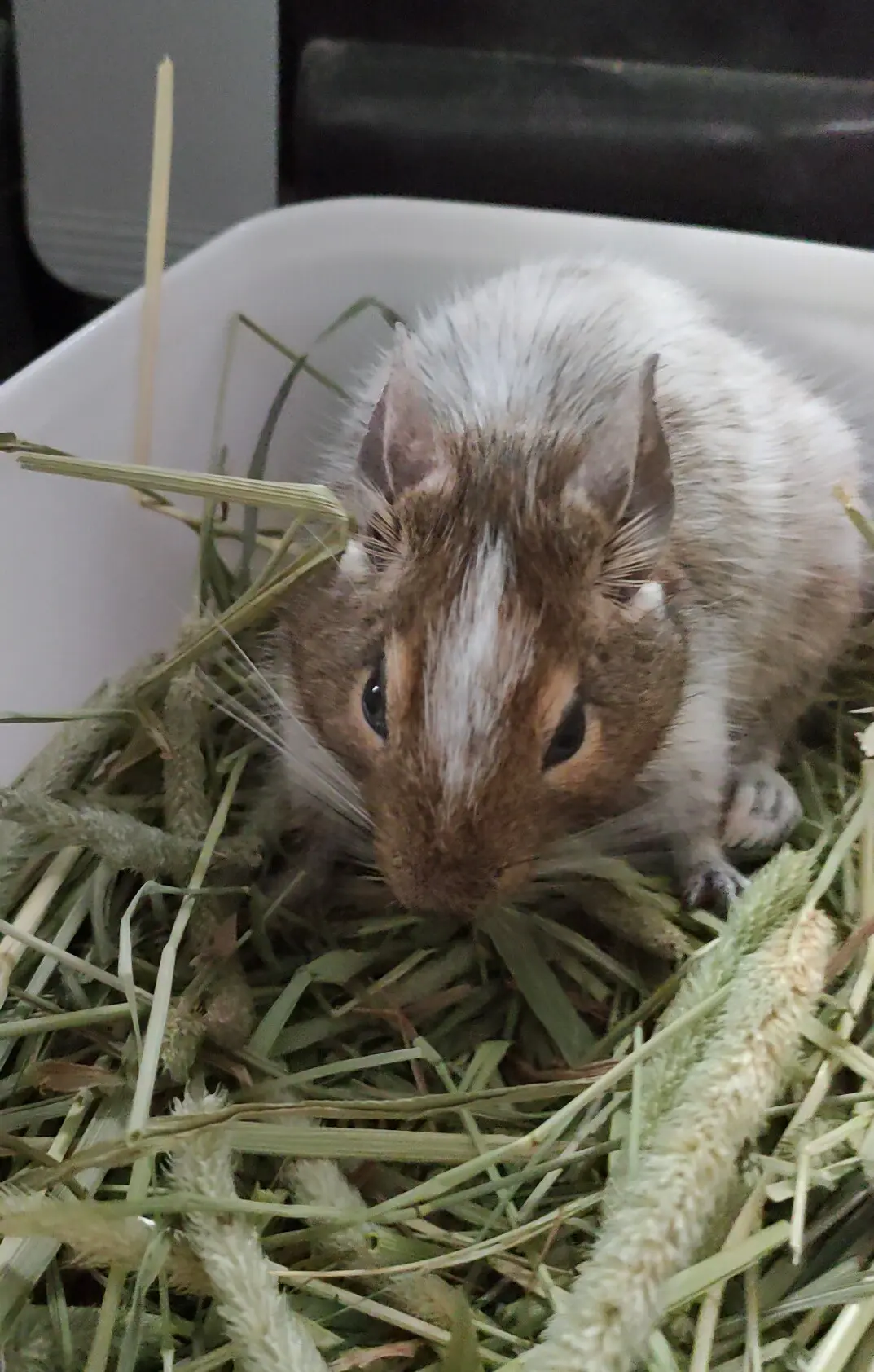胴体は白が多め、頭、手足、尻尾は茶色が多め 茶色のパイド 体調10センチ~13センチ 丸くなるともう少し小さいです。 体重290g チモシー以外に乾燥人参、生キャベツが好きです。 警戒心は少し強いです、慣ればナデナデが出来ます。 厚めの服や布で包むようにすれば抱っこできます。