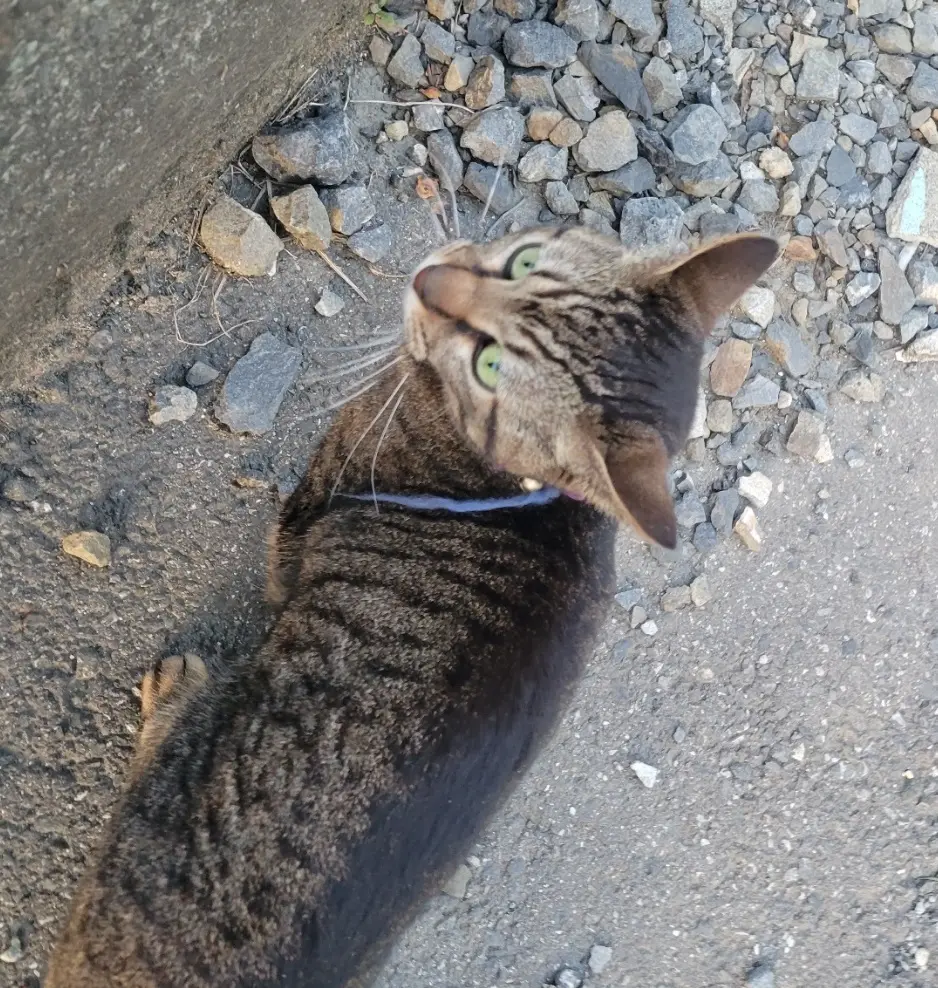 キジトラ柄?でとても人懐っこい 生地のような紫色の首輪をしています
